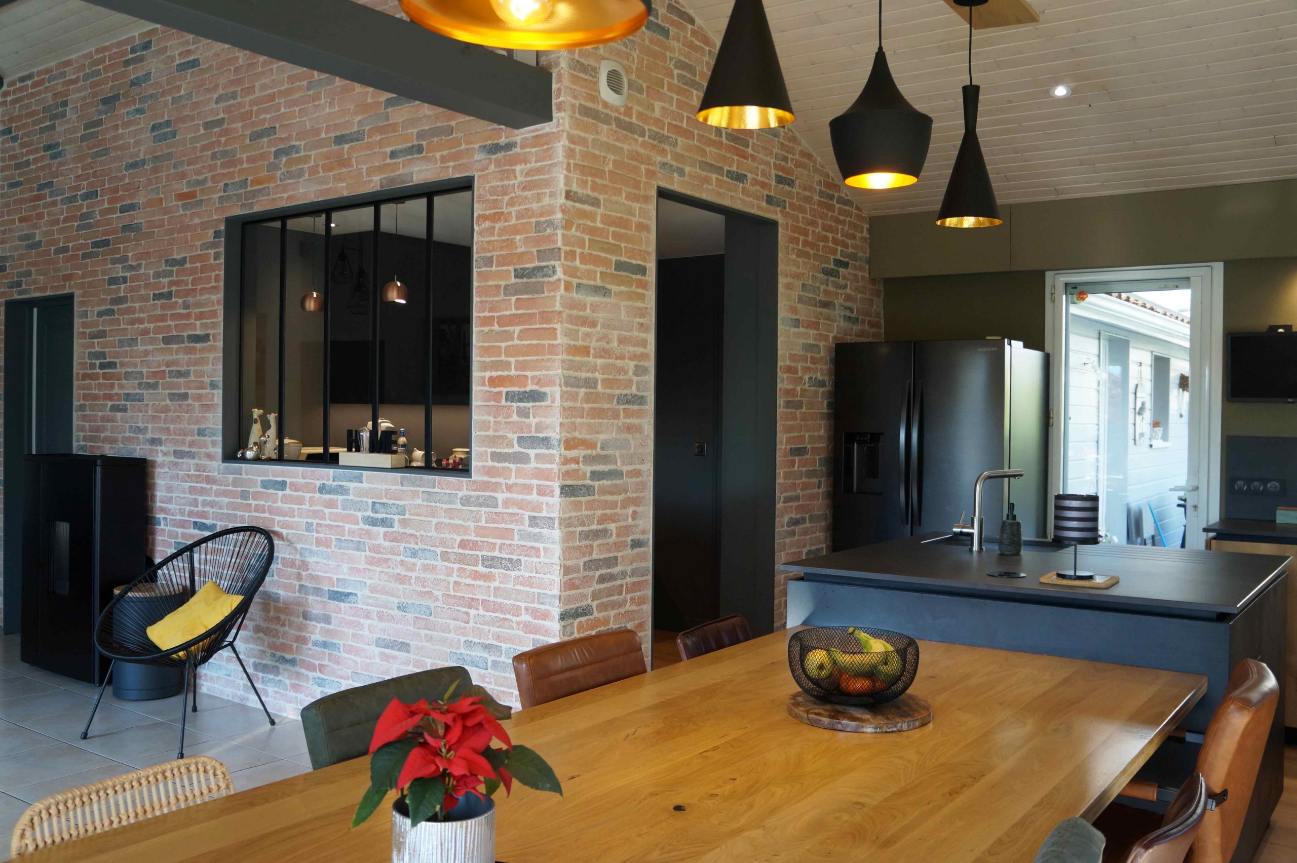 Réalisé par Guérin Brémaud : conception, fabrication et pose des cuisines, de la table et de l’armoire de rangement, pose de la verrière.